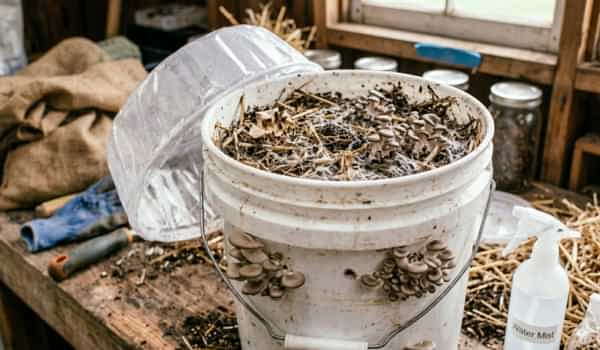 Singura diferență e că, în loc să lași ciupercile să crească direct din pungă, ai opțiunea să folosești paie și o găleată (dar nu mai mare de 18-20 de litri).